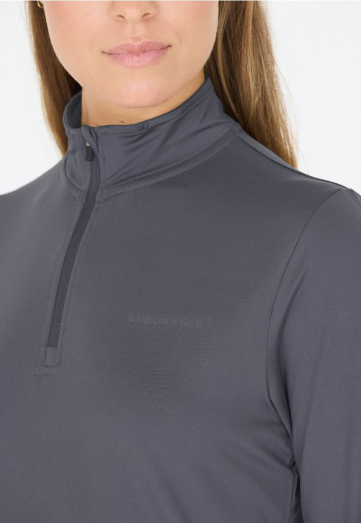 La capa intermedia "Aileen" para mujer convierte las horas de actividad en un éxito. Confeccionada en un tejido elástico en 4 direcciones con un 90% de poliéster y un 10% de elastano, ofrece una comodidad y una libertad de movimiento óptimas. La camiseta tiene un corte regular. Gracias a su transpirabilidad y a su función de secado rápido, te mantiene seca y fresca cuando entrenas, corres o estás al aire libre. Una elegante media cremallera con un pequeño cuello completa el look a la perfección. "Aileen" es perfecta como parte de un look a capas.